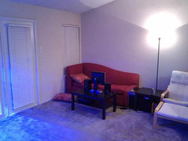 Then we have two pictures of the living room: Fish tank & Fireplace combo, and then our couch. I don't have a computer desk, so the coffee table works. In fact, I'm using that coffee table to prop my feet up right now.